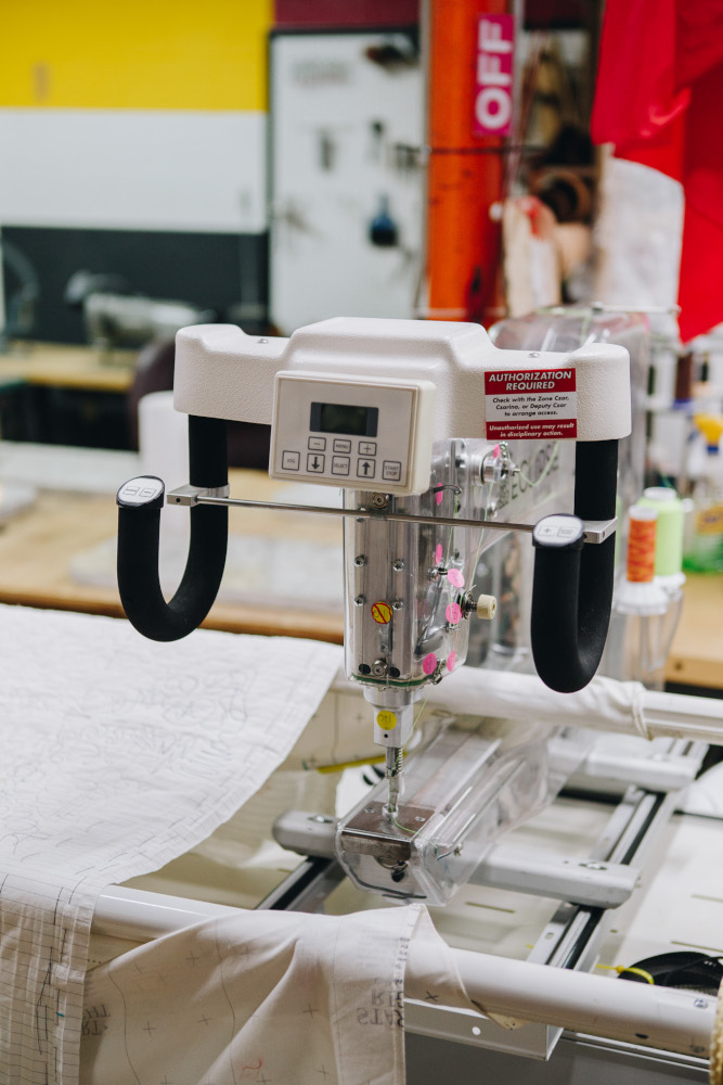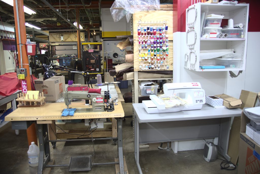 Our Fiber Art zone sees a lot of use. In addition to the basics like sewing machines, scissors, notions, and the like, we have a long-arm quilting machine, a CNC embroidery machine, an industrial sewing machine, a couple of big work tables, and a heat press.